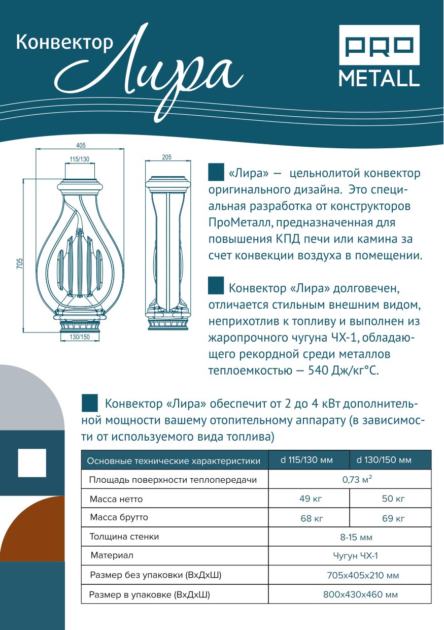 Конвектор «Лира» долговечен, отличается стильным внешним видом, неприхотлив к топливу и выполнен из жаропрочного чугуна ЧХ-1, обладает рекордной среди металлов теплоемкостью — 540 Дж/кг С. Конвектор «Лира» обеспечит от 2 до 4 кВТ дополнительной мощности вашему отопительному аппарату (в зависимости от используемого вида топлива)